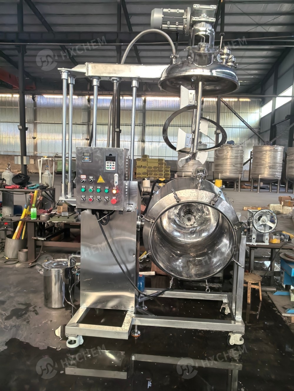 HXCHEM membekalkan homogenizer vakum keluli tahan karat 20 liter-500 liter untuk kosmetik dan ubat gigi. Pengadun pengemulsi vakum boleh digunakan dalam pengeluaran produk emulsi dalam industri penjagaan kulit. Pigmen, minyak, pelembap dan bahan-bahan lain dicampur sekata melalui homogenizer. Pengadun pengemulsi vakum sesuai untuk kilang kosmetik bagi menghasilkan pelbagai pes dan produk susu. Terutamanya digunakan dalam pengeluaran emulsi stabil, kosmetik, produk pembersihan, ubat gigi, dsb.